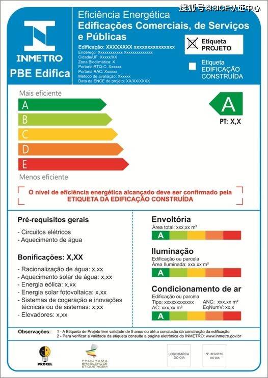 2014年8月通过的一项法律要求公共建筑展示能源效率标签。这个新的标签被称为PBE Edifica,将强制适用于所有地面面积超过500平方米的新建筑以及所有进行重大翻新的建筑。这个新标签将考虑三个方面的内容: