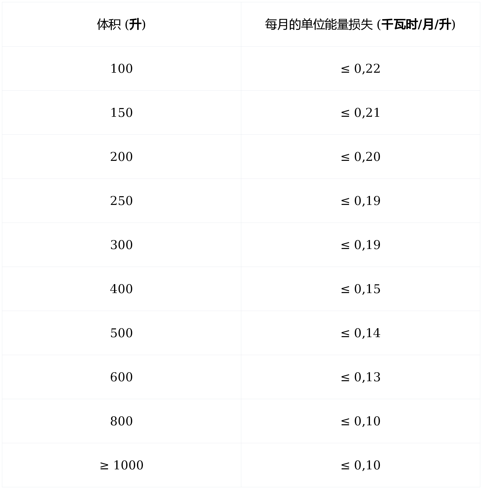 例如,下表列出了授予太阳能集热器A级所需的最低要求,以每月能源浪费为单位: